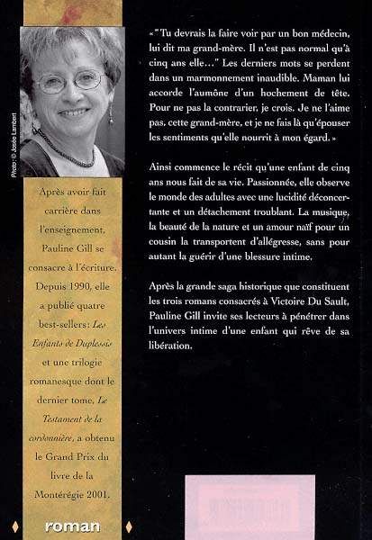Après la grande saga historique que constituent les trois romans consacrés à Victoire Du Sault, Pauline Gill invite ses lecteurs à pénétrer dans l’univers intime d’une enfant qui rêve de sa libération.