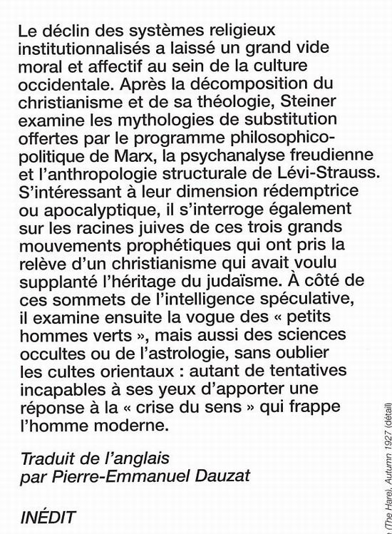 Le déclin des systèmes religieux institutionnalisés a laissé un grand vide moral et affectif au sein de la culture occidentale. Après la décomposition du christianisme et de sa théologie, Steiner examine les mythologies de substitution offertes par le programme philosophico-politique de Marx, la psychanalyse freudienne et l'anthropologie structurale de Lévi-Strauss.S'intéressant à leur dimension rédemptrice ou apocalyptique, il s'interroge également sur les racines juives de ces trois grands mouvements prophétiques qui ont pris la relève d'un christianisme qui avait voulu supplanté l'héritage du judaïsme. À côté de ces sommets de l'intelligence spéculative, il examine ensuite la vogue des «petits hommes verts», mais aussi des sciences occultes ou de l'astrologie, sans oublier les cultes orientaux: autant de tentatives incapables à ses yeux d'apporter une réponse à la «crise du sens» qui frappe l'homme moderne. Traduit de l'anglais par Pierre-Emmanuel Dauzat . Inédit . "Bibliothèques 10/18" dirigé par Jean-Claude Zylberstein .