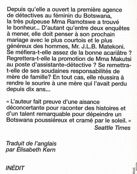 Depuis qu'elle a ouvert la première agence de détectives au féminin du Botswana, la très pulpeuse Mma Ramotswe a trouvé le bonheur... D'autant qu'entre deux enquêtes à mener, elle doit penser à son prochain mariage avec le plus courtois et le plus généreux des hommes, Mr. J.-L. Matekoni. Se méfiera-t-elle assez de la bonne acariâtre ? Regrettera-t-elle la promotion de Mma Makutsi au poste d'assistante-détective ? Se remettra-t-elle de ses soudaines responsabilités de mère de famille ? En tout cas, elle réussira à rendre le sourire à une mère qui l'avait perdu depuis dix ans...