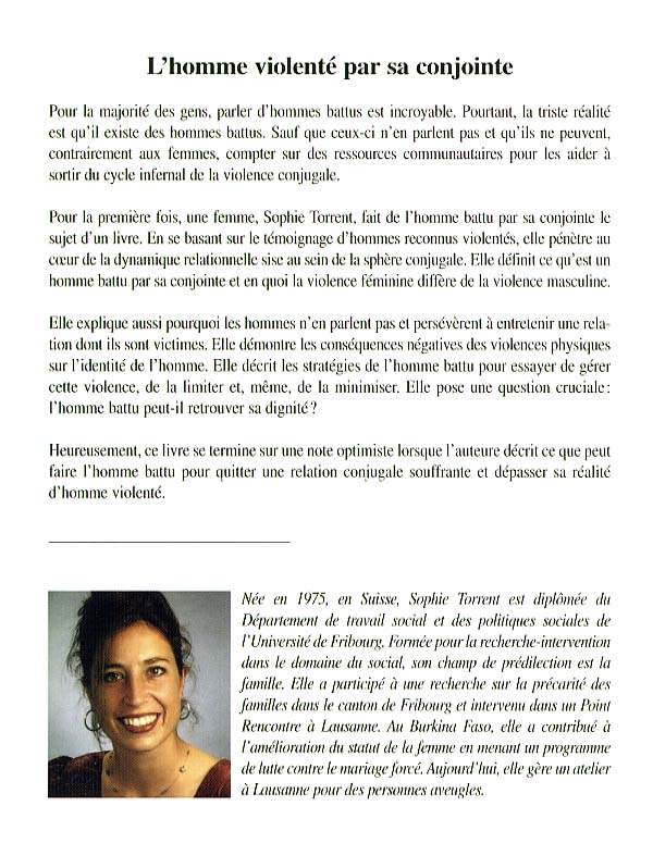 Ce livre souhaite briser le tabou des hommes violentés par leurs conjointes, sensibiliser la population et les intervenants socio-judiciaires à cette réalité. Il invite à dépasser les stéréotypes de l'homme agresseur et de la femme violente et rétablit la violence comme le fruit d'une interaction entre deux personnes responsables.