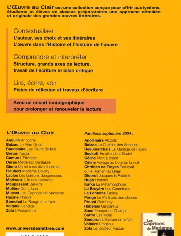 Contextualiser : L'auteur, ses choix et ses itinéraires. L'œuvre dans l'histoire et l'histoire de l'œuvre. Comprendre et interpréter : Structure, grands axes de lecture, travail de l'écriture et bilan critique. Lire, écrire, voir : Pistes de réflexion et travaux