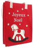Grand sac cadeau en feutrine rouge décoré d’un cheval à bascule et de l’inscription « Joyeux Noël ». Spacieux et élégant, il est parfait pour présenter vos présents avec une touche festive et tradi... » Lire la suite...
