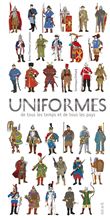Des tenues de soldats du monde entier, d'hier à aujourd'hui, sont présentées sur une double page par une illustration et un texte descriptif.