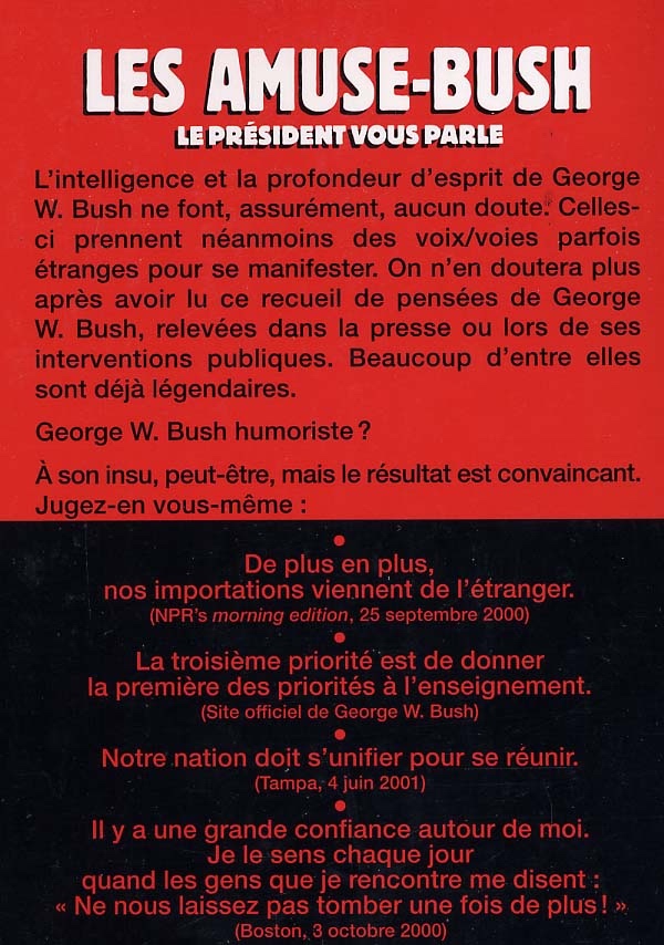 Recueil de propos mal formulés et prêtant au ridicule de George W. Bush, relevés dans la presse ou lors de ses interventions publiques. Beaucoup d'entre eux sont déjà légendaires.