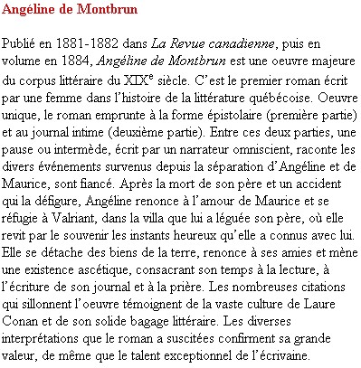Après la mort de son père et son accident qui la défigure, Angéline renonce à l'amour de Maurice et se réfugie à Valriant, dans la villa que lui a léguée son père, où elle revit par le souvenir les instants heureux qu'elle a connus avec lui. Elle se détache des biens de la terre, renonce à ses amies et mène une existence ascétique, consacrant son temps à la lecture, à l'écriture de son journal et à la prière. Les nombreuses citations qui sillonnent l'œuvre témoignent de la vaste culture de Laure Conan et de son solide bagage littéraire. Les diverses interprétations que le roman a suscitées confirment sa grande valeur, de même que le talent exceptionnel de l'écrivaine. Publié en 1881-1882 dans La Revue canadienne, puis en volume en 1884, Angéline de Montbrun est une œuvre majeure du corpus littéraire du XIXe siècle..