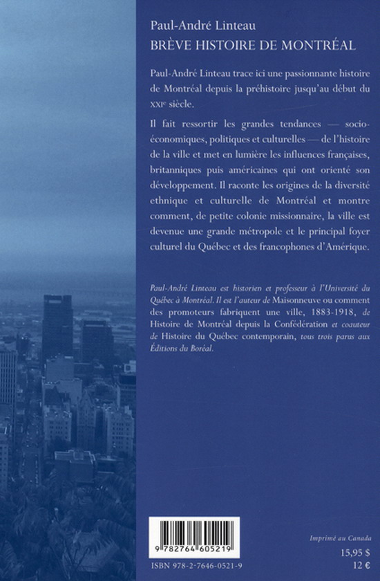 Paul-André Linteau trace ici une passionnante histoire de Montréal depuis la préhistoire jusqu'au début du XXIe siècle. Il fait ressortir les grandes tendances socioéconomiques, politiques et culturelles de l'histoire de la ville et met en lumière les influences françaises, britanniques puis américaines qui ont orienté son développement. Il raconte les origines de la diversité ethnique et culturelle de Montréal et montre comment, de petite colonie missionnaire, la ville est devenue une grande métropole et le principal foyer culturel du Québec et des francophones d'Amérique.