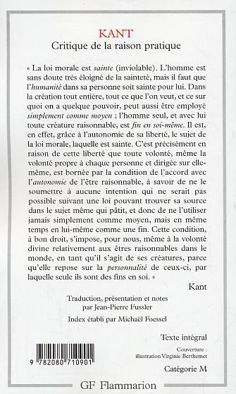 «La loi morale est sainte (inviolable). L'homme est sans doute très éloigné de la sainteté, mais il faut que l'humanité dans sa personne soit sainte pour lui. Dans la création tout entière, tout ce que l'on veut, et ce sur quoi on a quelque pouvoir, peut aussi être employé simplement comme moyen ; l'homme seul, et avec lui toute créature raisonnable, est fin en soi-même. Il est, en effet, grâce à l'autonomie de sa liberté, le sujet de la loi morale, laquelle est sainte. C'est précisément en raison de cette liberté que toute volonté, même la volonté propre à chaque personne et dirigée sur elle-même, est bornée par la condition de l'accord avec l'autonomie de l'être raisonnable, à savoir de ne le soumettre à aucune intention qui ne serait pas possible suivant une loi pouvant trouver sa source dans le sujet même qui pâtit, et donc de ne l'utiliser jamais simplement comme moyen, mais en même temps en lui-même comme une fin. Cette condition, à bon droit, s'impose, pour nous, même à la volonté divine relativement aux êtres raisonnables dans le monde, en tant qu'il s'agit de ses créatures, parce qu'elle repose sur la personnalité de ceux-ci, par laquelle seule ils sont des fins en soi.». Kant .