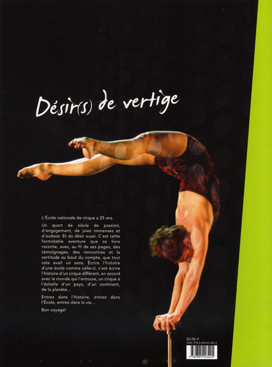 Désir(s) de vertige. L'École nationale de cirque, 25 ans d'audaces raconte, en mots et en images, l'histoire de cette école singulière qui, au fil des ans, a réussi à s'illustrer parmi les plus grandes écoles de cirque de la planète. Du centre Immaculée-Conception, où elle est née, en passant par la Gare Dalhousie, où elle a connu ses premières heures de gloire, l'École occupe aujourd'hui le premier bâtiment construit spécifiquement pour devenir une école de cirque. Située au coeur de la Cité des arts du cirque, l'École continue de former parmi des artistes de cirque parmi es plus grands au monde.