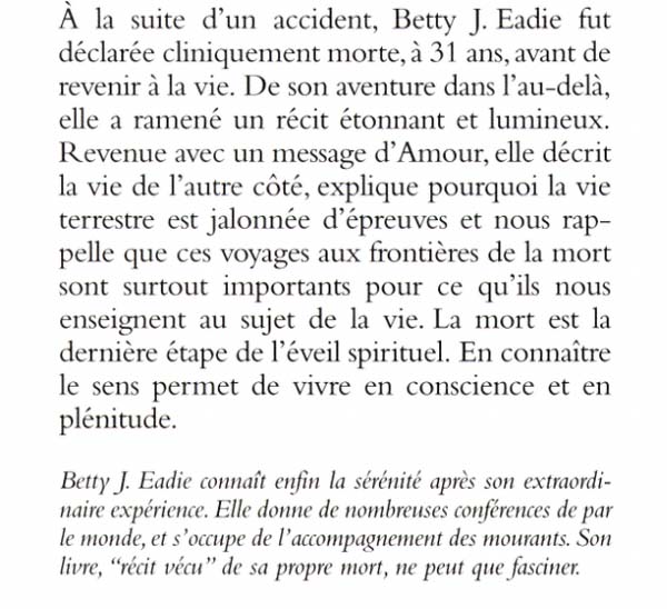 À la suite d'un accident, Betty J. Eadie fut déclarée cliniquement morte, à 31 ans, avant de revenir à la vie. De son aventure dans l'au-delà, elle a ramené un récit étonnant et lumineux. Revenue avec un message d'Amour, elle décrit la vie de l'autre côté, explique pourquoi la vie terrestre est jalonnée d'épreuves et nous rappelle que ces voyages aux frontières de la mort sont surtout importants pour ce qu'ils nous enseignent au sujet de la vie. La mort est la dernière étape de l'éveil spirituel. En connaître le sens permet de vivre en conscience et en plénitude.