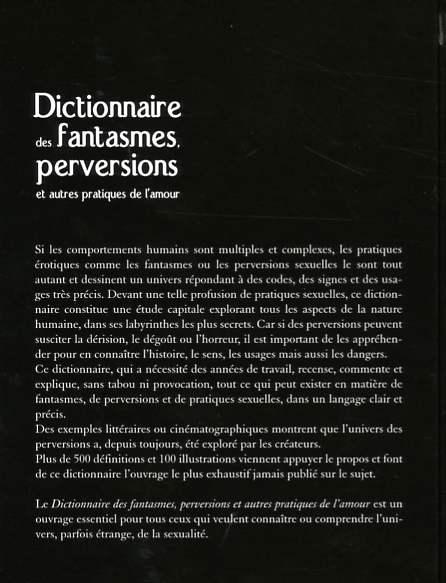 Si les comportements humains sont multiples et complexes, les pratiques érotiques comme les fantasmes ou les perversions sexuelles le sont tout autant et dessinent un univers répondant à des codes, des signes et des usages très précis. Devant une telle profusion de pratiques sexuelles, ce dictionnaire constitue une étude capitale explorant tous les aspects de la nature humaine, dans ses labyrinthes les plus secrets. Car si des perversions peuvent susciter la dérision, le dégoût ou l'horreur, il est important de les appréhender pour en connaître l'histoire, le sens, les usages mais aussi les dangers. Ce dictionnaire, qui a nécessité des années de travail, recense, commente et explique, sans tabou ni provocation, tout ce qui peut exister en matière de fantasmes, de perversions et de pratiques sexuelles, dans un langage clair et précis. Des exemples littéraires ou cinématographiques montrent que l'univers des perversions a, depuis toujours, été exploré par les créateurs. Plus de 500 définitions et 100 illustrations viennent appuyer le propos et font de ce dictionnaire l'ouvrage le plus exhaustif jamais publié sur le sujet. Le Dictionnaire des fantasmes, perversions et autres pratiques de l'amour est un ouvrage essentiel pour tous ceux qui veulent connaître ou comprendre l'univers, parfois étrange, de la sexualité.