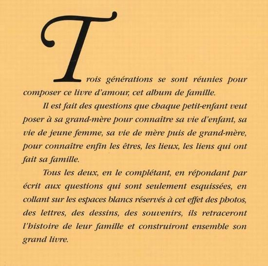 Trois générations se sont réunies pour composer ce livre d'amour, cet album de famille. Il est fait des questions que chaque petit-enfant veut poser à sa grand-mère pour connaître sa vie d'enfant, sa vie de jeune femme, sa vie de mère puis de grand-mère, pour connaître enfin les êtres, les lieux, les liens qui ont fait sa famille. Tous les deux, en le complétant, en répondant par écrit aux questions qui sont seulement esquissées, en collant sur les espaces blancs réservés à cet effet des photos, des lettres, des dessins, des souvenirs, ils retraceront l'histoire de leur famille et construiront ensemble son grand livre.