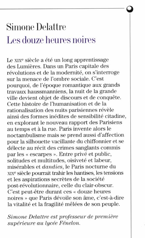 Le XIXe siècle a été un long apprentissage des Lumières. Dans un Paris capitale des révolutions et de la modernité, on s'interroge sur la menace de l'ombre sociale. C'est pourquoi, de l'époque romantique aux grands travaux haussmanniens, la nuit de la grande ville devient objet de discours et de conquête. Cette histoire de l'humanisation et de la rationalisation des nuits parisiennes révèle ainsi des formes inédites de sensibilité citadine, en explorant le nouveau rapport des Parisiens au temps et à la rue. Paris invente alors le noctambulisme mais se prend aussi d'affection pour la silhouette vacillante du chiffonnier et se délecte au récit des crimes sanglants commis par les " escarpes ". Entre privé et public, solitudes et multitudes, oisiveté et labeur, misérables et dandies, le Paris nocturne du XIXe siècle pourrait trahir les hantises, les tensions et les aspirations secrètes de la société post-révolutionnaire, celle du clair-obscur. C'est peut-être durant ces " douze heures noires " que Paris dévoile son âme, c'est-à-dire la vitalité et la fragilité mêlées de son peuple.