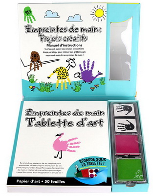 Grâce à ces tampons d'empreinte de mains spéciaux et ces tampons encreurs colorés, peins et réalise des animaux très mignons et d'autres personnages. Avec des empreintes de main, remplis les scènes amusantes de la tablette à dessin de tes fantastiques créations ! Ce coffret comprend : 1 manuel d'instructions, 4 pots de peinture aquarelle, Tablette à dessin, 2 tampons d'empreinte de main, 2 tampons encreurs, 2 marqueurs et 1 pinceau.