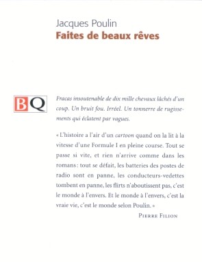 Quatrième roman de Jacques Poulin, Faites de beaux rêves raconte une singulière histoire d’amour durant une course automobile de Formule I, à la piste du Mont-Tremblant, dans les Laurentides. Entre le journaliste Théo, véritable encyclopédie des courses de Formule I qui écrit pour la revue Track and Traffic, et son doux frère Amadou, commis aux écritures et amoureux de Limoilou, les liens du sang sont troubles et instables. Derrière un festival de scotch et de bière, de filles et de moteurs déchaînés se joue le drame d’un amour qui s’éteint avant même d’avoir complètement pris feu : Limoilou quittera-t-elle Amadou et Théo, à la fin de ce rituel sportif qui n’a plus rien d’un conte de fée?