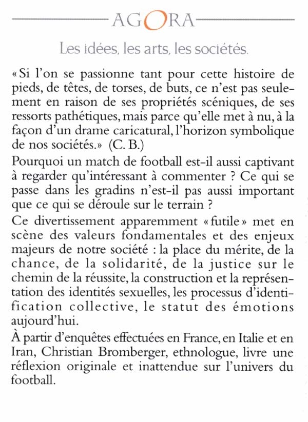 " Si l'on se passionne tant pour cette histoire de pieds, de têtes, de torses, de buts, ce n'est pas seulement en raison de ses propriétés scéniques, de ses ressorts pathétiques, mais parce qu'elle met à nu, à la façon d'un drame caricatural, l'horizon symbolique de nos sociétés. " (C.B.) Pourquoi un match de football est-il aussi captivant à regarder qu'intéressant à commenter ? Ce qui se passe dans les gradins n'est-il pas aussi important que ce qui se déroule sur le terrain ? Ce divertissement apparemment " futile " met en scène des valeurs fondamentales et des enjeux majeurs de notre société : la place du mérite, de la chance, de la solidarité, de la justice sur le chemin de la réussite, la construction et la représentation des identités sexuelles, les processus d'identification collective, le statut des émotions aujourd'hui. A partir d'enquêtes effectuées en France, en Italie et en Iran, Christian Bromberger, ethnologue, livre une réflexion originale et inattendue sur l'univers du football.