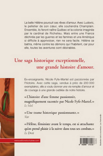 Dans une France déchirée par les guerres de Religion, Hélène vit ses premiers émois amoureux avec le jeune Ludovic. Mais, à 12 ans, la fille du secrétaire du roi apprend qu’on la marie à un grand explorateur de l’Amérique, de 28 ans son aîné… Elle se soumet en apparence à la loi du père, mais n’oublie pas pour autant ses rêves et ses désirs. Si le premier tome de cette fresque historique prend place en France, le second nous entraîne en Nouvelle-France, aux premières heures de la colonie. Courageuse, Hélène se battra, même contre les démons qui l’habitent, car pour elle, toutes les aventures sont désirables. Le dernier tome illustrera la fin de la vie de cette femme déterminée, de retour en France. Une grande saga, un roman de cape et d’épée mené par une folle d’amour.