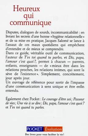 Disputes, dialogues de sourds, incommunicabilité : en livrant les secrets d'une bonne " hygiène relationnelle " et de sa mise en pratique, Jacques Salomé se lance à l'assaut de ces maux quotidiens qui empêchent d'entendre et de mieux se comprendre. Dans ce guide, véritable outil de communication, l'auteur de T'es toi quand tu parles, et Dis, papa, l'amour c'est quoi ? permet à chacun - parents, enfants, enseignants - de " mieux être dans les relations proches, les relations intimes, qui sont la sève de l'existence ". Simplement, concrètement, jour après jour. Un ouvrage de référence pour sortir de l'impasse d'une communication à sens unique et être enfin entendu.