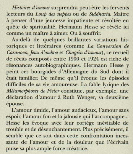 Histoires d'amour . Histoires d'amour surprendra peut-être les fervents lecteurs du Loup des steppes ou de Siddhartha. Maître à penser d'une jeunesse impatiente et révoltée en quête de spiritualité, Hermann Hesse se révèle ici comme un maître à aimer. Ou à souffrir. Au-delà de quelques brillantes variations historiques et littéraires (comme La Conversion de Casanova, Jeux d'ombres et Chagrin d'amour), ce recueil de récits, composés entre 1900 et 1924, est riche de résonances autobiographiques. Hermann Hesse y peint ces bourgades d'Allemagne du Sud dont il était familier. De même qu'il évoque les épisodes difficiles de sa vie amoureuse : ainsi, la fable lyrique des Métamorphoses de Pictor constitue une déclaration d'amour à Ruth Wenger, sa deuxième épouse. Hesse évoque l'amour sous toutes ses formes avec son cortège inévitable de trouble et de désenchantement.