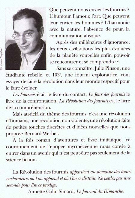 Que peuvent nous envier les fourmis ?. L'humour, l'amour, l'art. Que peuvent leur envier les hommes ? L'harmonie avec la nature, l'absence de peur, la communication absolue.. Après des millénaires d'ignorance, les deux civilisations les plus évoluées de la planète vont-elles enfin pouvoir se rencontrer et se comprendre ? Sans se connaître, Julie Pinson, une étudiante rebelle, et 103e, une fourmi exploratrice, vont essayer de faire la révolution dans leur monde respectif. Les Fourmis était le livre du contact, Le Jour des Fourmis le livre de la confrontation. La Révolution des Fourmis est le livre de la compréhension.. À la fois roman d'aventures et livre initiatique, ce couronnement de l'épopée myrmécéenne nous convie à entrer dans un avenir qui n'est peut-être pas seulement de la science-fiction.... La saga des fourmis : Les Fourmis. Le Jour des Fourmis. La Révolution des Fourmis.