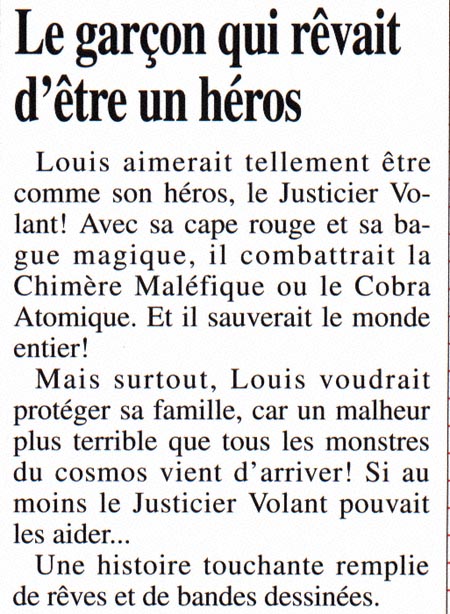 Louis aimerait tellement être comme son héros, le Justicier Volant ! Avec sa cape rouge et sa bague magique, il combattrait la Chimère Maléfique ou le Cobra Atomique. Et il sauverait le monde entier !