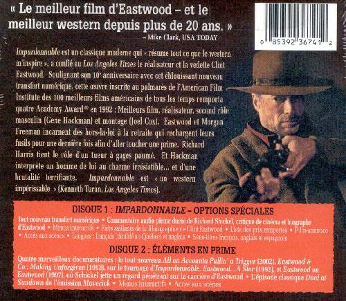 Impardonnable est un classique moderne qui « résume tout ce que le western m’inspire », a confié au Los Angeles Times le réalisateur et la vedette Clint Eastwood. Soulignant son 10e anniversaire avec cet éblouissant nouveau transfert numérique, cette 0euvre inscrite au palmarès de l’American Film Institute des 100 meilleurs films américains de tous les temps remporta quatre Academy Award en 1992 : Meilleurs film, réalisateur, second rôle masculin (Gene Hackman) et montage (Joel Cox). Eastwood et Morgan Freeman incarnent des hors-la-loi à la retraite qui rechargent leurs fusils pour une dernière fois afin d’aller toucher une prime. Richard Harris tient le rôle d’un tueur à gages paumé. Et Hackman intreprète un homme de loi au charme irrésistible et d’une brutalité terrifiante. Impardonnable est « un western impérissable » (Kenneth Turan, Los Angeles Times).
