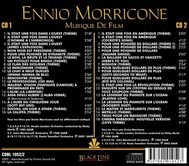 CD2: Il Etait Une Fois En Amérique (Thème) - Il Etait Une Fois En Amérique (Cockeye's Song) - Pour Une Poignée De Dollars (Thème 1) - Pour Une Poignée De Dollars (Thème 2) - Pour Une Poignée De Dollars (Square Dance) - La Ballade De Sacco Et Vanzetti (Here's To You) - Mission (Thème) - Pour Quelques Dollars De Plus (Thème) - Pour Quelques Dollars De Plus (Sixty-Second To What) - Pour Quelques Dollars De Plus (Bye Bye Colonel) - Il Etait Une Fois La Révolution (Thème) - Enquête Sur Un Citoyen Au Dessus De Tout Soupçon (Thème) - La Légende Du Pianiste Sur L'Océan (Playing Love) - La Légende Du Pianiste Sur L'Océan (Goodbye Duet) - Le Maître Et Marguerite (Thème) - Metello (Thème) - Trois Pour Un Massacre (Thème) - Cinéma Paradisio Nouvelle Version (Love Thème)