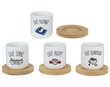 Ensemble de quatre tasses avec sous-verres en bambou, chacune décorée d’une illustration amusante sur le thème du café. Idéal pour égayer les pauses café entre amis ou au bureau, tout en ajoutant u... » Read more...