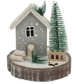 Charmante décoration représentant une petite maison enneigée entourée d’un sapin et de bûches. Parfaite pour créer une ambiance hivernale douce et accueillante dans votre décor de Noël.